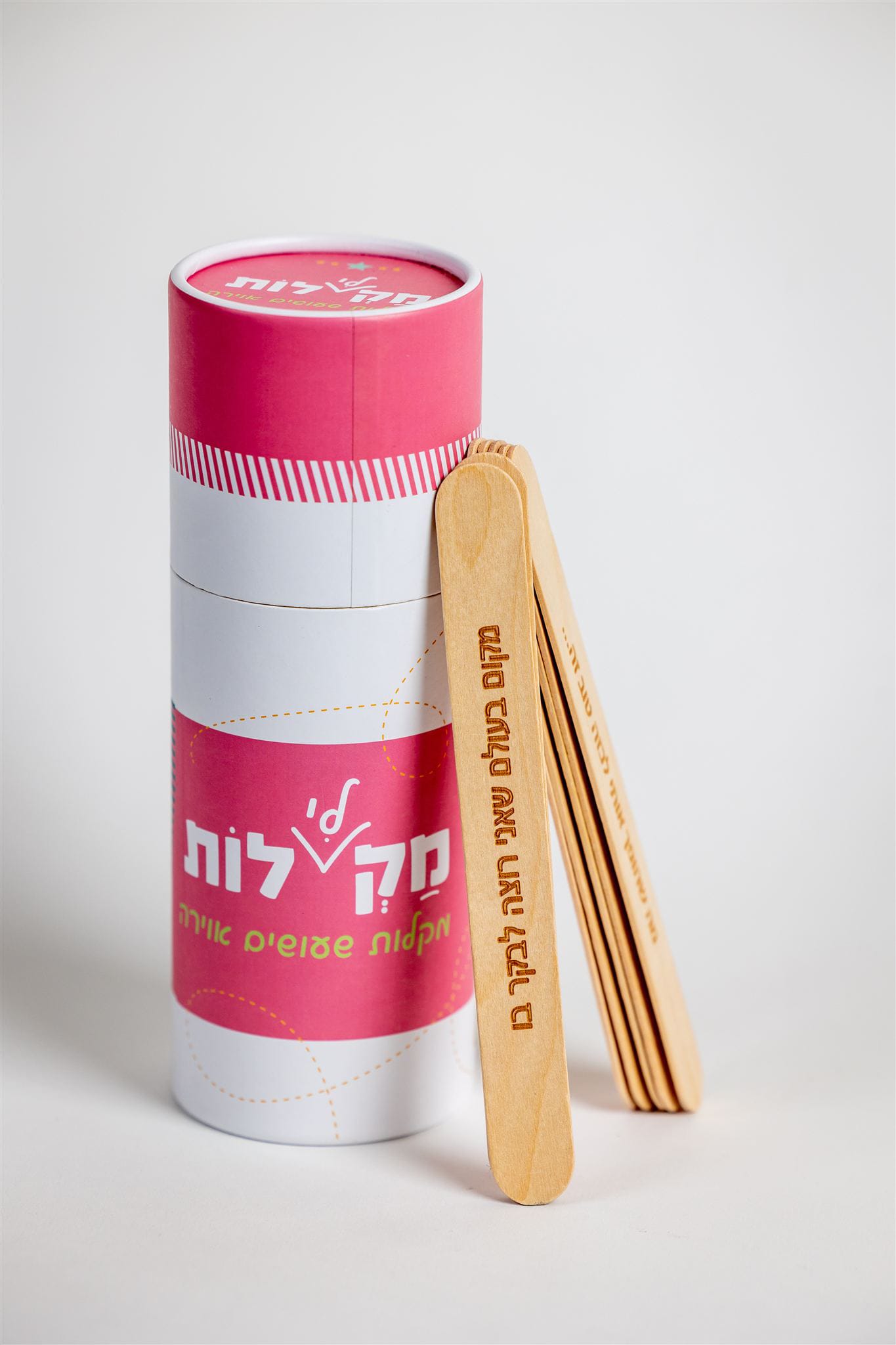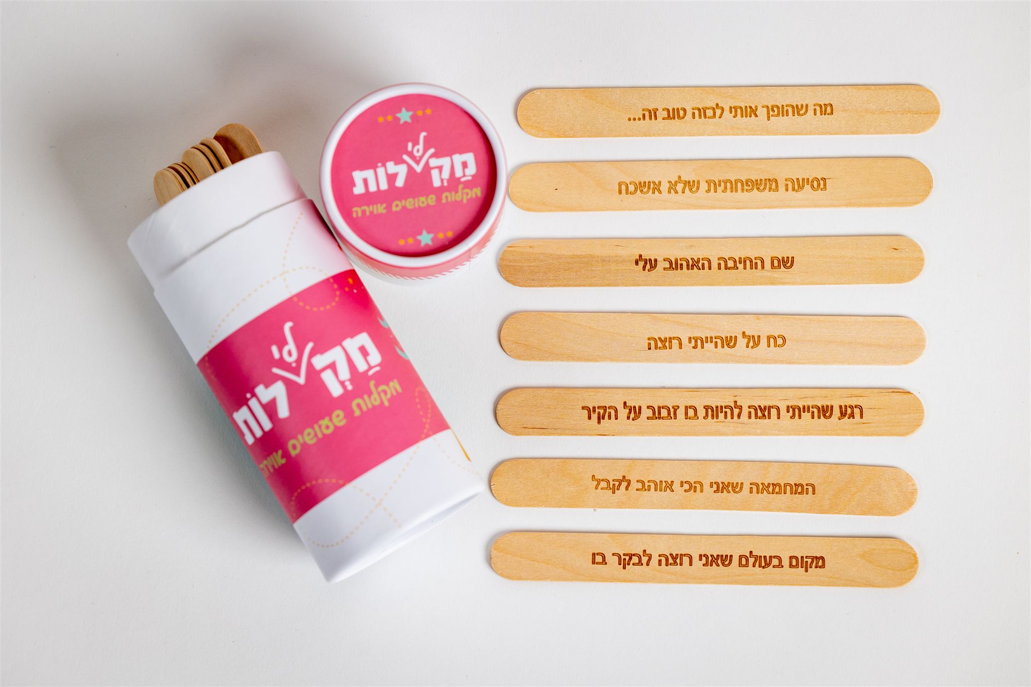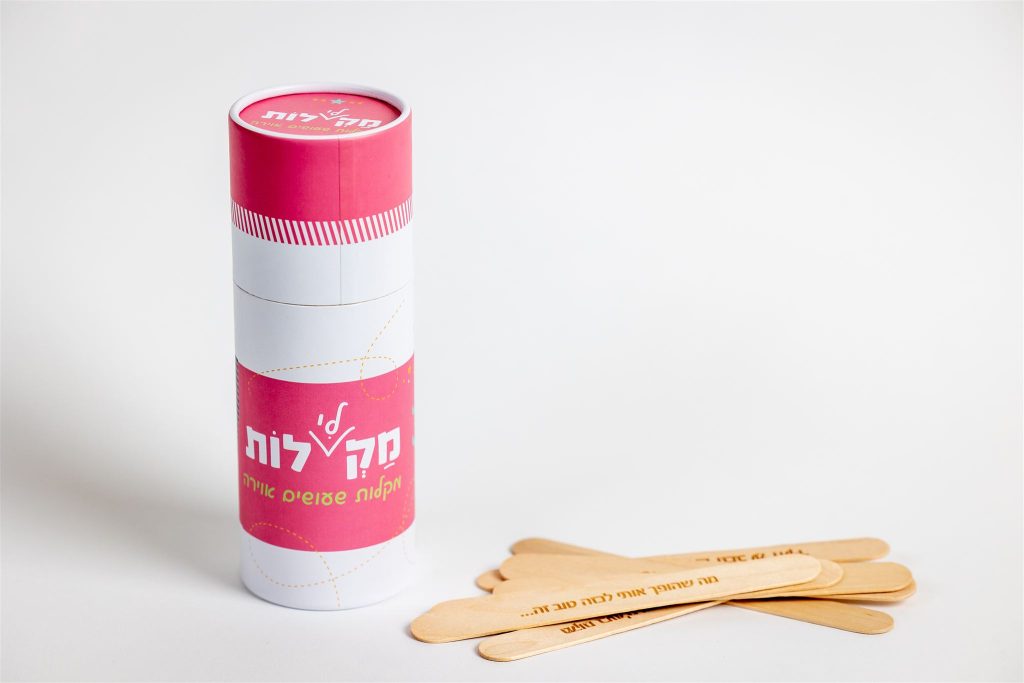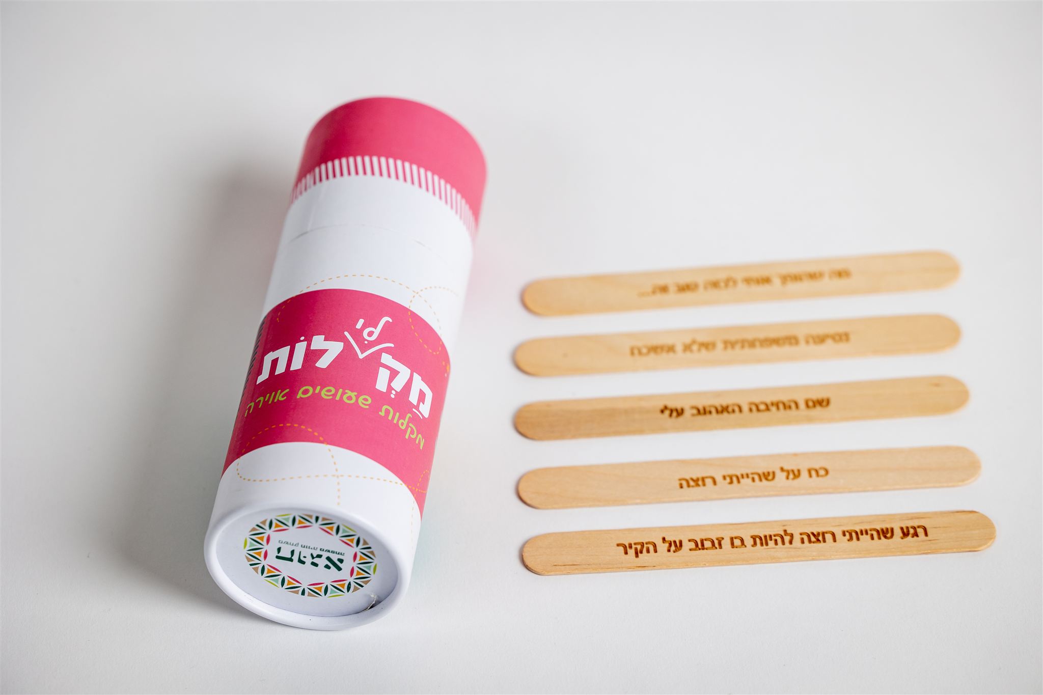 20 מקלות, עם היגדים שונים , המזמינים לשיחה כיפית והיכרות מזוית אחרת, בתוך קופסא גלילית מהממת.